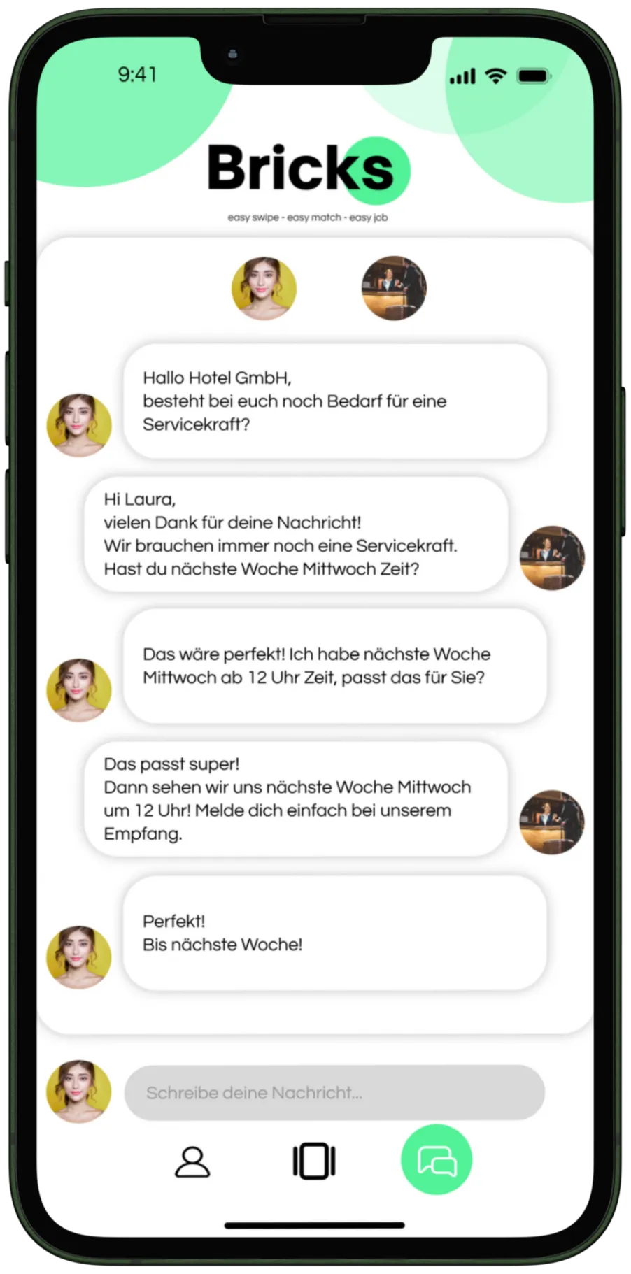 Mit Bricks bleibst du entspannt und lässt deine Persönlichkeit durchscheinen, wenn du mit deinen Job-Matches chattest. Bei Bricks muss sich niemand verstellen!